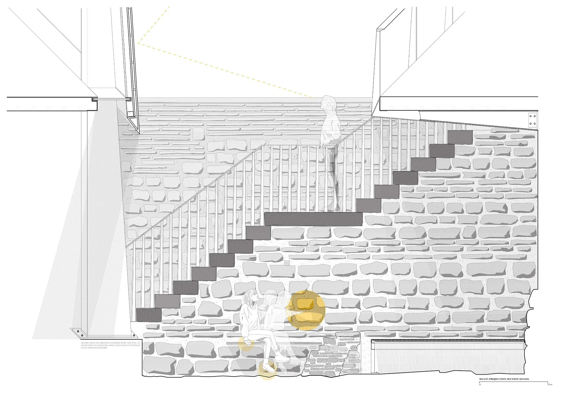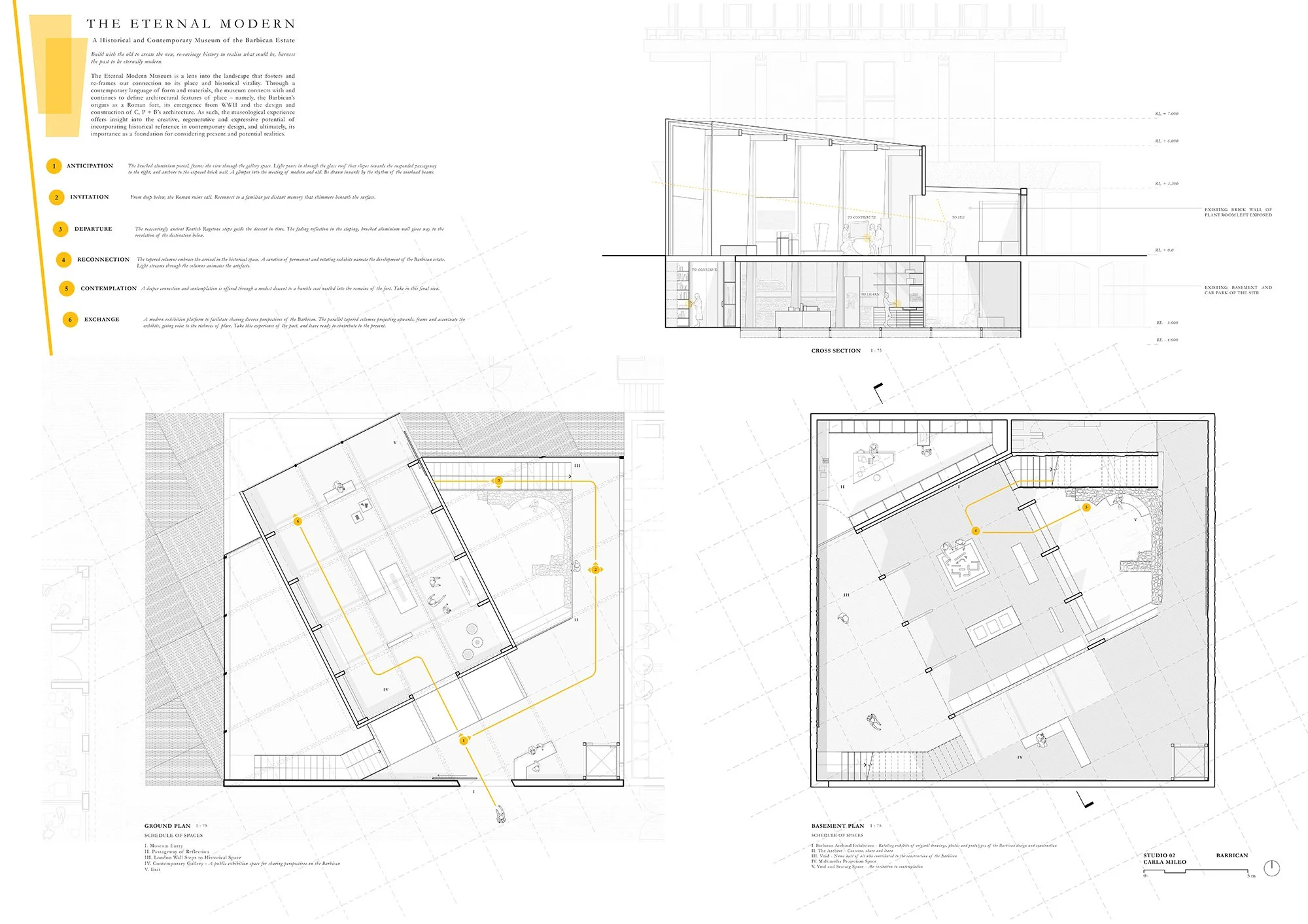 The Eternal Modern Museum is a lens into the landscape that fosters and re-frames our connection to its place and historical vitality. Through a contemporary language of form and materials, the museum connects with and continues to define architectural features of place – namely, the Barbican’s origins as a Roman fort, its emergence from WWII and the design and construction of C, P + B’s architecture.